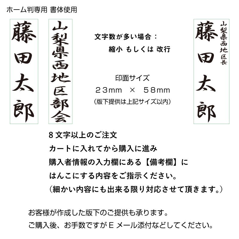 ホーム判にするお名前を入力して頂き弊社にお任せいただけると幸いです。お客様が書体の変更、文字の大きさの指定、また肩書など指定し2行ものとするなど、詳細な指示をすることもできます。(注1) また完全版下提供も可能です。(注2)詳細を知りたいお客様は以下に案内していますので、お手数ですが最後までお読みください。